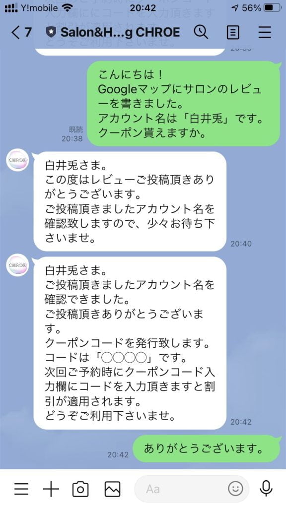 ご連絡頂きまして、サロンスタッフが確認次第、20%オフのクーポンコードを発行致します。