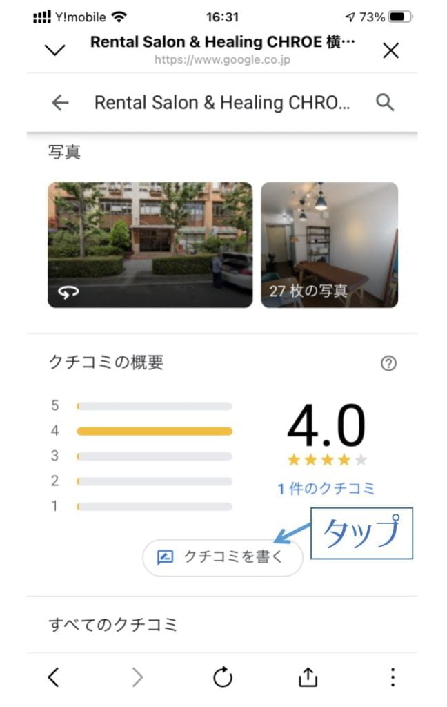 すると「クチコミを書く」というボタンが現れるので、タップします。