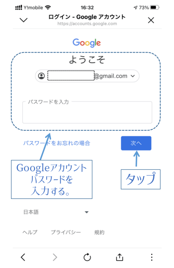 Googleアカウントとパスワード入力後、「次へ」をタップすると、