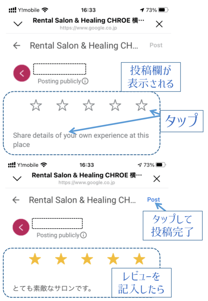 ※Googleマップのレビューご投稿方法をご存じの方は、こちらのボタンからアクセス頂きますと、当サロンのマップへアクセスできます。