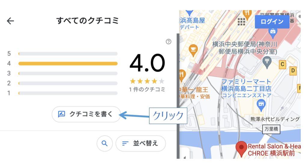 すると、「クチコミを書く」ボタンが現れますので、こちらをクリックします。