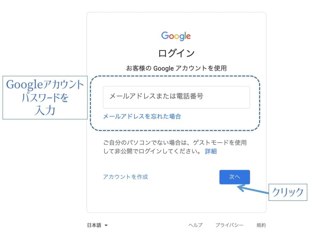 Googleアカウントとパスワードを入力して、「次へ」のボタンをクリックします。