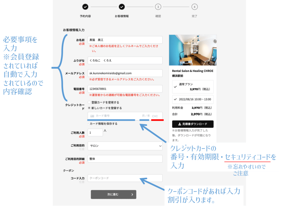 ご予約時の必要事項に加えてクーポンコードを入力して、「次に進む」をクリックしますと、クーポンコード適用後の割引された金額が表示されます。