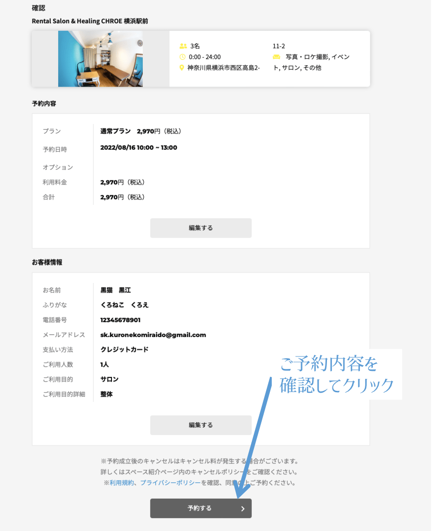 ご予約内容を確認して、「予約する」をクリックするとご予約が完了いたします。