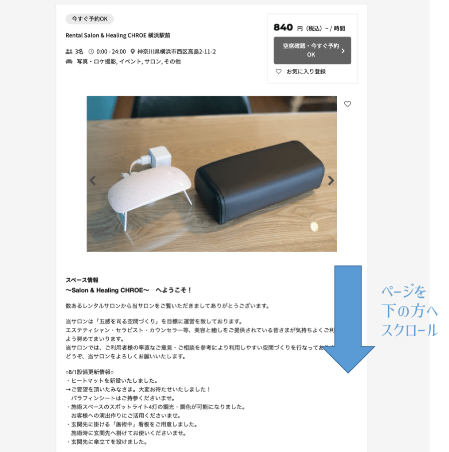 サロンの概要のページを下へスクロースします。