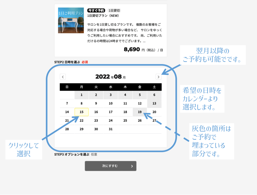 ※日付が灰色になっている箇所は、ご予約不可・あるいは既に予約が埋まってしまっています。