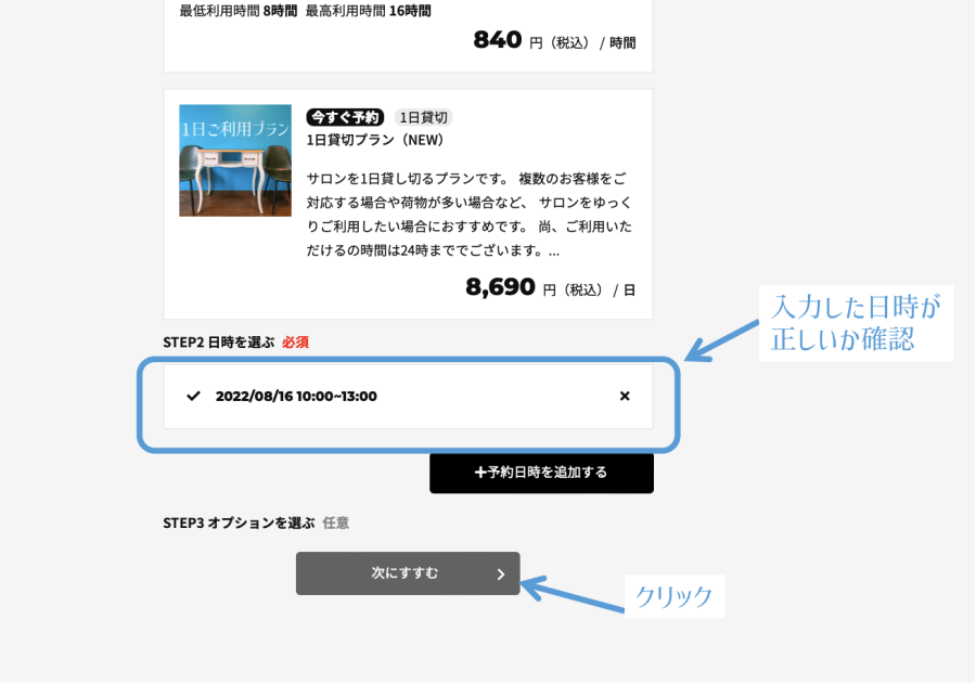 予約内容画面に戻り、日時が選択されていることを確認します。