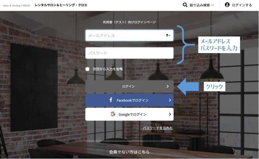 ログイン画面では、メールアドレス・パスワードを入力し、「ログイン」ボタンをクリックしてください。