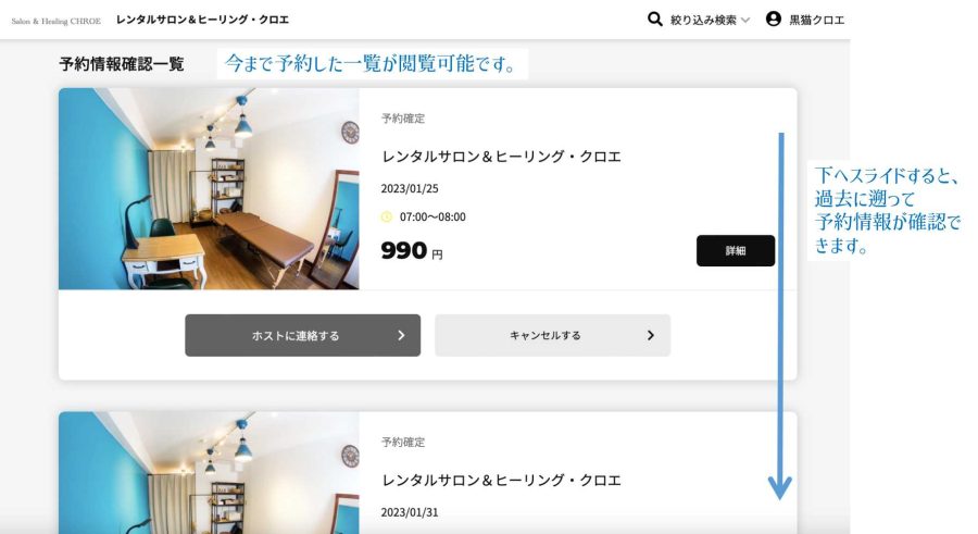 下へ画面をスクロールすることで。過去のご予約も閲覧できます。